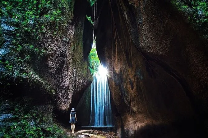 Na manhã seguinte, começamos mais devagar—graças a Deus! Primeiro, visitamos a cachoeira Tukad Cepung antes que fique cheia. Uma curta caminhada por bananal e pedras escorregadias leva a um cânion que parece uma caverna, onde a luz do sol invade de repente. A água cai direto por uma abertura no teto; parece até cenário para Instagram, mas é real quando você sente o spray fresco no rosto.