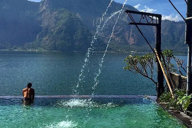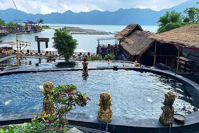 Depois da descida, seguimos direto para as águas termais próximas. As piscinas ficam em terraços à beira do lago—algumas mais quentes que outras—e dá para ouvir os pássaros cantando nas árvores acima. A água tem um leve cheiro mineral, mas é uma delícia depois da trilha; meus músculos agradecem na hora. Os locais conversam baixinho em balinês enquanto crianças brincam na água. Eu fico flutuando um pouco, observando o vapor subir no ar da montanha.