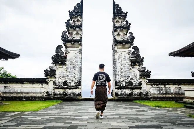 No Lempuyang, enrolamos sarongs na cintura (eles são fornecidos) e subimos os degraus rumo ao famoso Portão do Céu. Tem uma pequena fila para as fotos — todo mundo quer aquele clique perfeito — mas o tempo passa rápido vendo as nuvens cobrirem a montanha ou conversando com os locais que vendem pacotinhos de amendoim e chá doce. O ar aqui em cima é mais fresco, quase gelado, e dá para sentir um leve aroma de incenso das oferendas deixadas pelos fiéis.