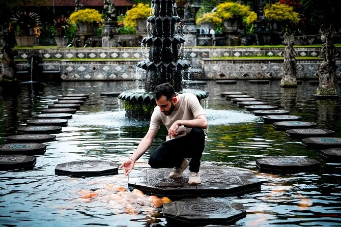 Próxima parada: Palácio das Águas de Karangasem. O lugar é tranquilo, com carpas nadando nos lagos e pontes de pedra que cruzam a água. Nosso guia apontou as esculturas nas paredes do palácio — cada uma conta um pedaço da história balinesa. Caminhamos pelos jardins sombreados, ouvindo o coaxar dos sapos por perto.