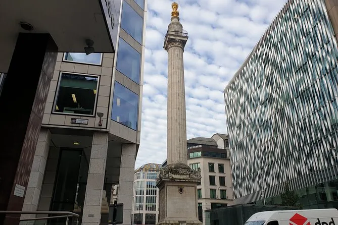 O passeio nos levou por esses cantinhos silenciosos na City — St. Dunstan-in-the-East era um deles. Hoje, só restam arcos destruídos e vinhas entrelaçadas, um lugar bombardeado na guerra, mas com uma paz estranha. Vi alguém do grupo passando a mão na pedra, perdido em pensamentos. Seguimos adiante, desviando de trabalhadores e ônibus até chegar ao Monumento (nunca tinha reparado o quanto ele é alto até estar bem embaixo), e o Tom explicou o quanto de Londres foi consumida pelo fogo em 1666. Ele contou sobre uma pedra cheia de lendas malucas — não vou estragar, mas me fez rir alto.