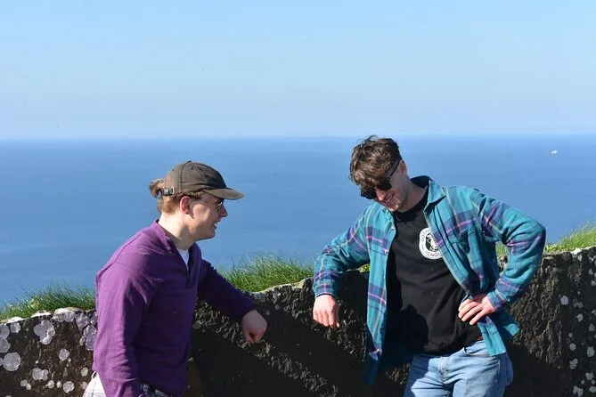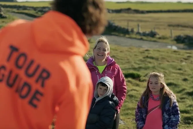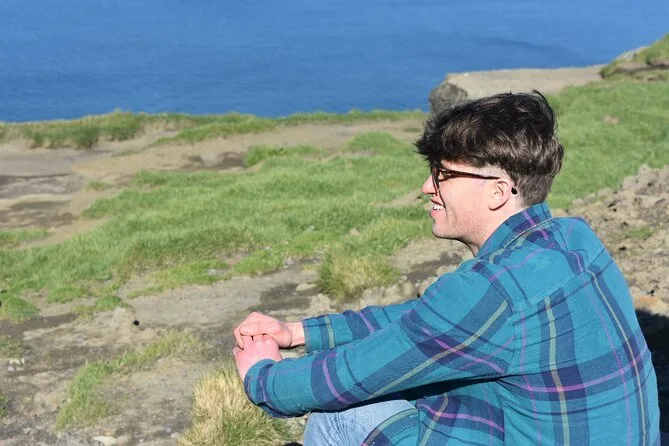 A caminhada não é curta — cerca de oito quilômetros — mas fomos devagar. Teve um momento no meio do caminho em que o vento aumentou e só dava para ouvir as gaivotas e o som das ondas quebrando lá embaixo. Pat contou que menos de 3% dos visitantes fazem essa trilha (depois conferi, ele não estava inventando). Em um ponto, paramos para fotos e alguém tentou falar “Aillte an Mhothair”. O Pat riu e deu uma rápida aula de irlandês — ninguém acertou, mas quebrou o gelo.