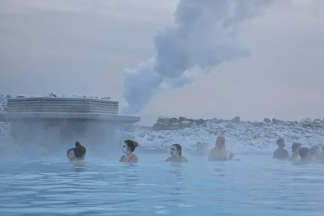 O clima na Islândia é imprevisível; quando chegamos na cratera Kerið, as nuvens já tinham mudado e a luz do sol iluminava as encostas vermelhas, que pareciam até pintadas. Einar contou que as pessoas às vezes cantam dentro da cratera só pela ecoação — ele mesmo não se arriscava (“muitos turistas com câmeras”, disse). Minhas botas estalavam na lama congelada enquanto caminhávamos ao redor. E, finalmente, a Lagoa Azul. O vapor subindo daquela água leitosa parecia surreal depois de um dia de vento e chuva. Você recebe uma toalha e aquela máscara de sílica (que é meio gosmenta, mas estranhamente gostosa), além de uma bebida — escolhi um drink azul neon só porque sim. Flutuar ali ao entardecer foi uma sensação estranhamente tranquila, como se tudo ao redor tivesse desaparecido, deixando só nosso grupo quietinho sob o céu.