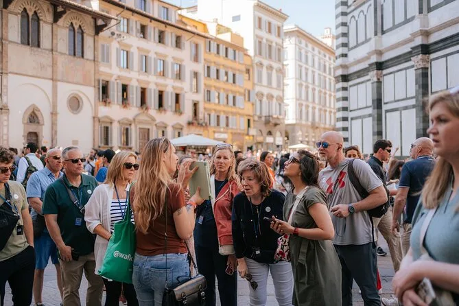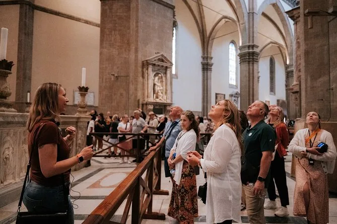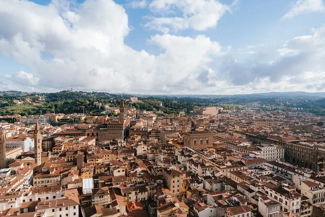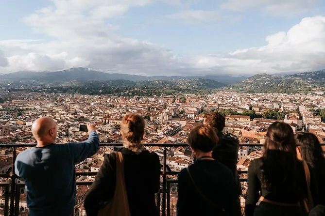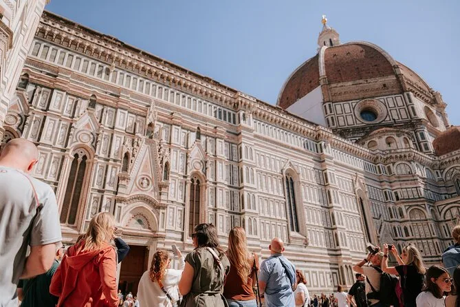 Seu dia inclui ingressos sem fila para a Galeria da Accademia (para ver o David) e para a Catedral de Florença — com acesso especial aos terraços exclusivos do Duomo — e todas as entradas já estão pagas. Você será acompanhado por um guia especialista que fala inglês, em grupo pequeno (máximo 18 pessoas), usará fones de ouvido quando necessário e terá um ingresso válido por 72 horas para visitar outros monumentos como o Batistério ou o Museu Opera Duomo depois do tour.