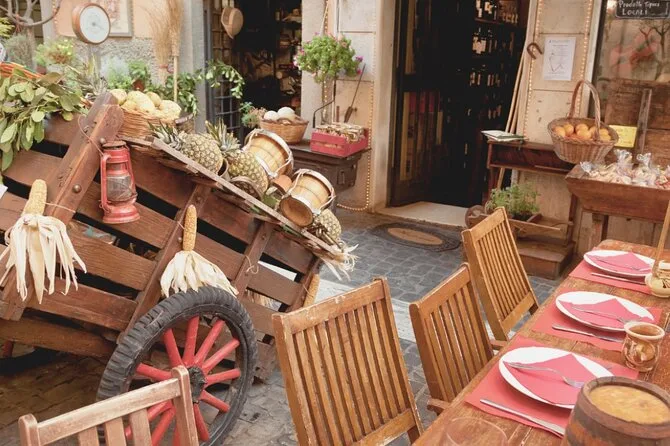 Seu dia inclui ida e volta de trem de Roma Termini a Frascati com recepção na estação, passeios guiados por lojas e padarias históricas para provar delícias (como biscotti fresquinho e porchetta), transporte até uma vinícola familiar para visitar as adegas e degustar três vinhos locais mais azeite com pão, seguido de um almoço completo com pratos típicos romanos e mais vinho, antes de voltar de trem à tarde.