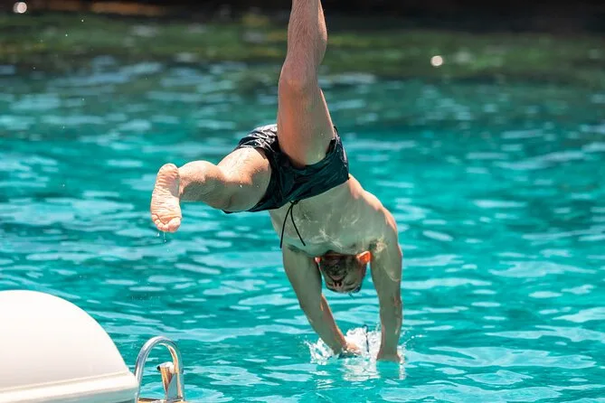 Ancoramos perto da baía de areia de Favignana — a água tinha um brilho meio rosado sobre a areia branca. Achei que fosse um efeito da luz até o Salvo explicar que era por causa do coral triturado. Mergulhar foi um choque (mais frio do que eu esperava), mas logo ficou perfeito. Alguns já foram direto para o snorkel; eu fiquei flutuando de costas, olhando para os penhascos e tentando lembrar se já tinha visto água tão transparente assim. Acho que não. Depois passamos perto de Bue Marino — as pedreiras de tufo parecem ruínas antigas, com linhas marcantes e pedra clara contrastando com o mar azul.