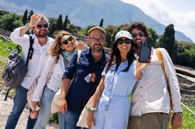 A manhã começou cedo na estação Termini, em Roma — quase perdi o grupo porque me distraí com uma barraca de espresso (vale muito a pena). O trem rápido para Nápoles é tão veloz que mal dá tempo de se ajeitar antes de já estar chegando. Marco nos recebeu com um sorriso largo e um “Benvenuti!”, logo nos levando para o ônibus rumo a Pompeia. Ele soltava curiosidades sobre as erupções do Vesúvio e as padarias romanas como se tivesse nascido ali (na verdade, ele cresceu perto). Caminhar por aquelas ruas antigas com ele foi menos aula e mais passeio com um amigo que conhece cada detalhe curioso.