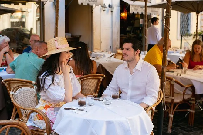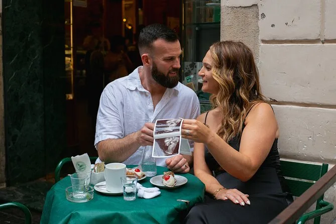 A última parada foi o Pantheon. Estava mais cheio do que eu esperava, mas de algum jeito a Yulia achou ângulos que deixavam o lugar quase silencioso. Ela deu umas dicas suaves (“Olhem um para o outro, não para mim!”), mas deixou a gente ser natural. Pulamos a Fontana di Trevi porque estava lotada — pelo que soubemos, o melhor é ir lá no nascer do sol se quiser espaço pra respirar (anotado para a próxima). Depois, sentamos num muro baixo e dividimos um cornetto enquanto ela mostrava algumas fotos na tela da câmera. Até hoje penso naquela em que estamos os dois com os olhos semicerrados pelo sol — não perfeita, mas a nossa cara.