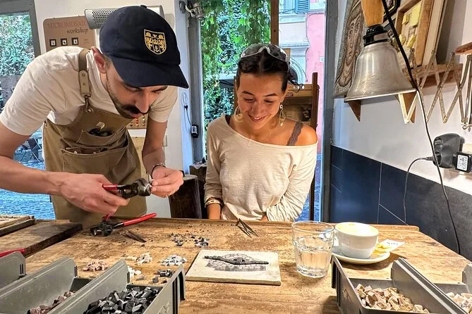 Você vai entrar em um estúdio romano de mosaicos de verdade e aprender com artistas locais a cortar, montar e criar sua própria obra usando ferramentas tradicionais e mármore. Aproveite um café ou chá durante a aula e leve para casa seu mosaico finalizado como uma lembrança única — é uma experiência prática, pessoal e cheia de pequenos momentos inesquecíveis.