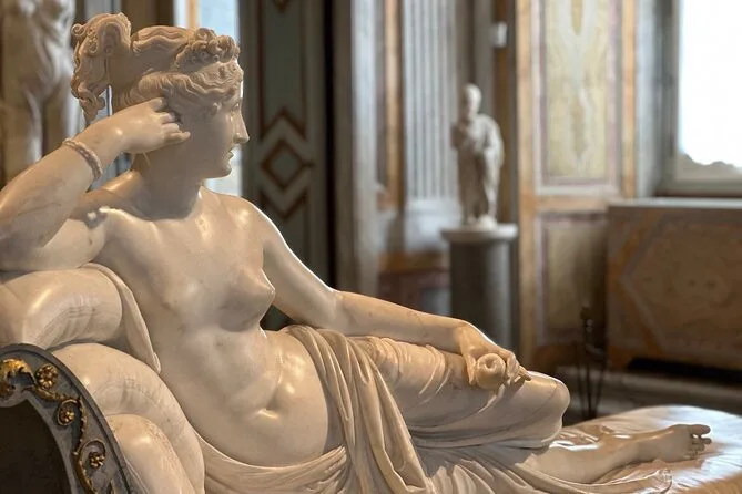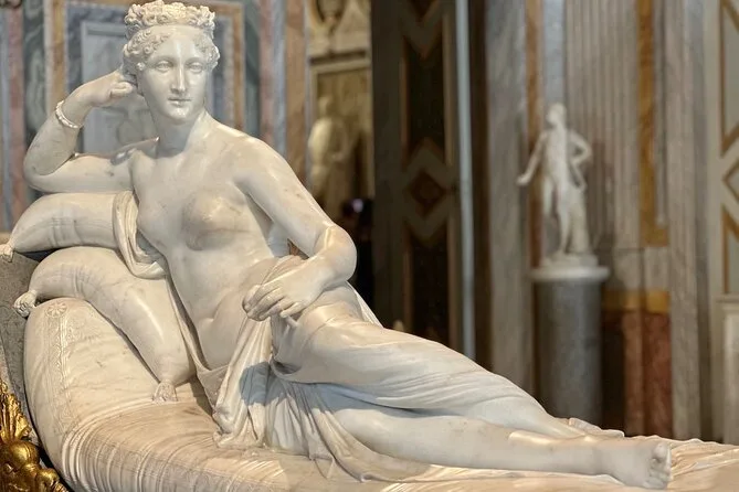A primeira sala tinha um cheiro leve de cera de madeira antiga e um toque floral — talvez lírios? Marta nos levou direto para a escultura de Bernini, Apolo e Dafne. Ela pediu para andarmos devagar ao redor dela, e em um momento riu quando eu disse que os dedos dos pés da Dafne pareciam realmente estar virando raízes (parecem mesmo). O mármore é tão liso que quase parece macio na luz da manhã. Eu me peguei várias vezes querendo tocar, até lembrar que aqui não se pode encostar em nada. Depois vimos a Pauline Bonaparte de Canova — reclinada como se fosse dona do lugar, o que, na verdade, ela meio que foi por um tempo.