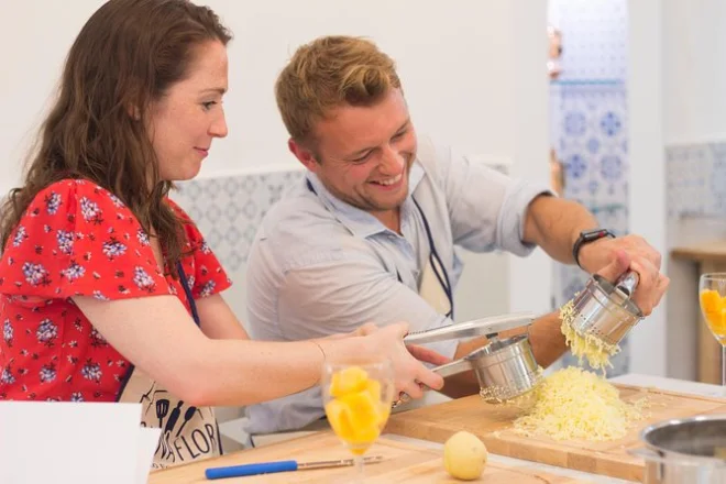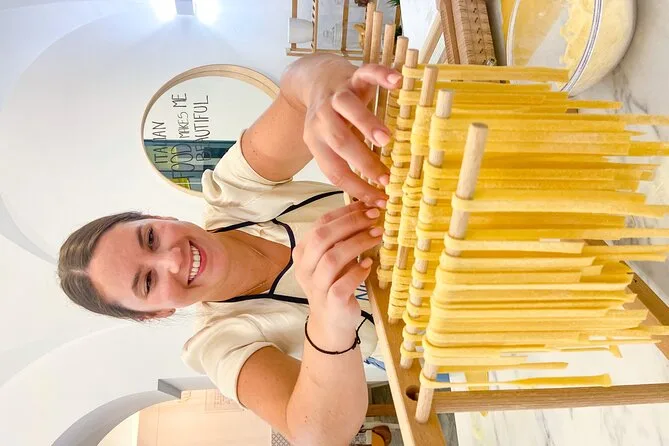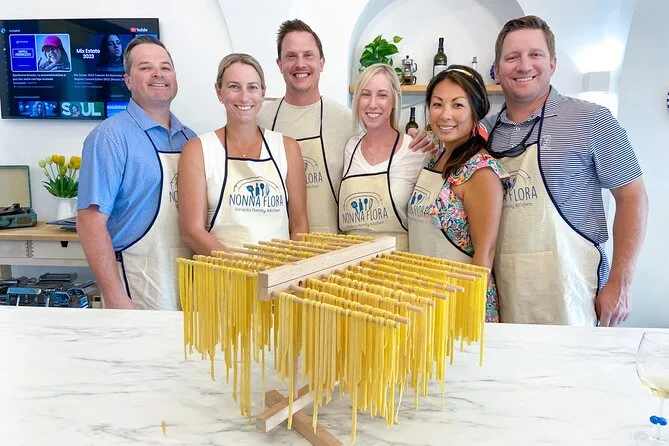 Seu dia inclui um drink de boas-vindas (limoncello ou coquetel), todos os ingredientes para fazer massa na escola Nonna Flora no centro de Sorrento, uso de avental durante a aula, água mineral, cerveja artesanal local ou vinho para acompanhar a refeição, café napolitano após a sobremesa, fotos digitais da aula e, claro, um almoço completo com tudo que vocês prepararam antes de voltar para a cidade.