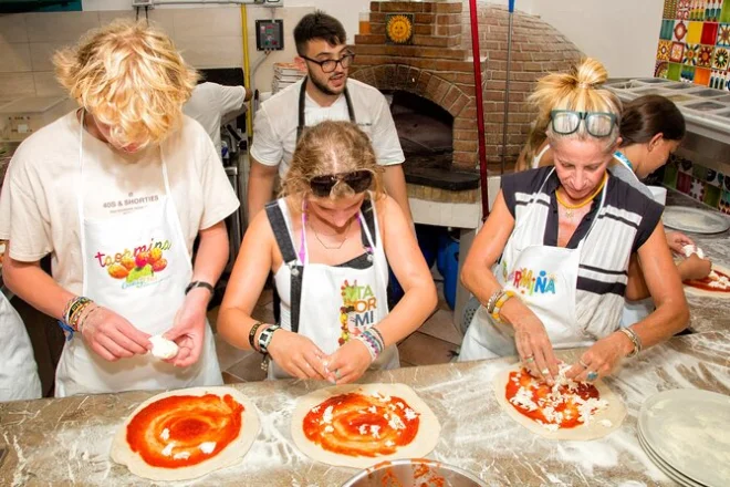 Coloque a mão na massa no centro de Taormina, aprendendo os segredos da pizza com chefs locais que fazem você rir tanto quanto ensinam. Prove queijos, deguste vinho siciliano e compartilhe o almoço em mesas grandes com novos amigos. No fim, você leva um certificado — e talvez um pouco de farinha nas mãos.