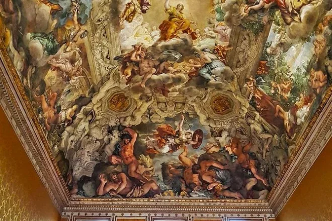 Passamos um bom tempo no Salone, com a cabeça inclinada para trás para admirar o afresco no teto de Pietro da Cortona. É enorme — sinceramente, dá para ficar ali por horas e ainda descobrir coisas novas. O iPad que nossa guia carregava facilitava ampliar detalhes da “Judite decapitando Holofernes”, de Caravaggio, sem precisar disputar espaço. Havia um grupo de crianças da escola por perto, mas as salas são grandes o suficiente para não parecer lotado.