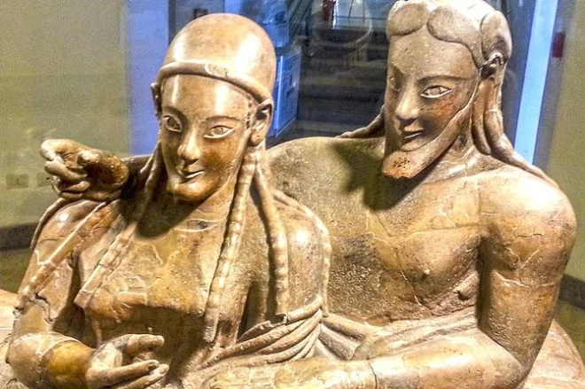 Dentro do museu, é fácil esquecer que estamos a poucos minutos do trânsito da cidade. O próprio museu está instalado nesta villa do século XVI, construída para o Papa Júlio III — tetos afrescados, salões de mármore com eco e tudo mais. Francesca nos levou direto às Tábuas de Pyrgi; são pequenas, mas reluzentes, e ela ampliou a imagem no tablet para que pudéssemos ver de perto a antiga escrita etrusca. Ficamos um tempo junto ao Sarcófago dos Cônjuges — um casal congelado num abraço — e ela explicou como era raro ver mulheres representadas como iguais naquela época. Foi um momento de silêncio, quando percebi o quanto aquelas pessoas moldaram a Itália antes mesmo da fundação de Roma.