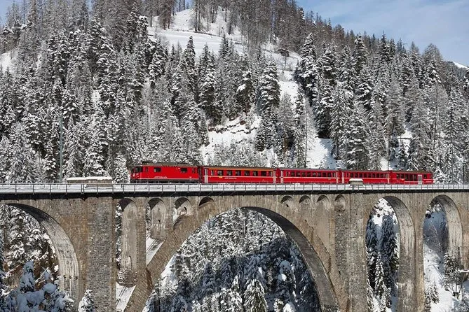 Seu dia inclui transporte de ida e volta entre Milão e St. Moritz em ônibus com ar-condicionado e passagem de segunda classe no Trem Vermelho Bernina, além de guia profissional durante todo o percurso. A busca no hotel está disponível se selecionada na reserva. Você também terá tempo livre em St. Moritz — incluindo uma parada na melhor chocolateria da Suíça — antes de voltar para Milão juntos.
