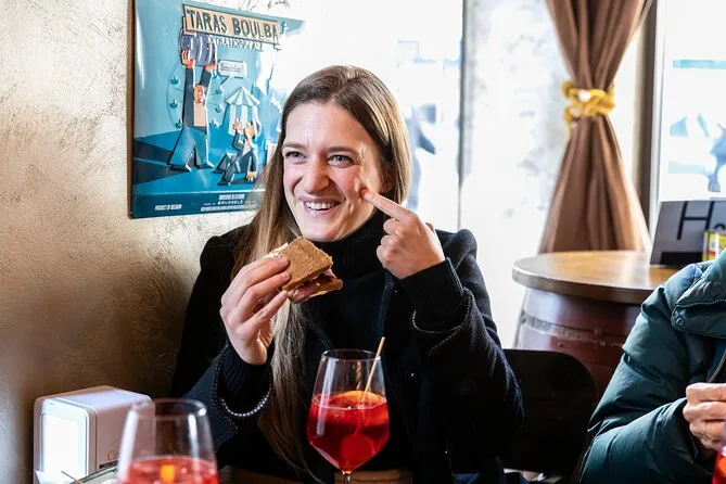 Sua tarde inclui degustações de tramezzini clássicos numa padaria centenária, petiscos cicchetti com prosecco col fondo em bacari tradicionais, uma aula prática de spritz com mais duas delícias venezianas como baccalà mantecato e saor, um prato principal autêntico com vinho branco local numa trattoria familiar, além da escolha entre tiramisù ou gelato para a sobremesa, antes de voltar juntos pelas charmosas margens dos canais.