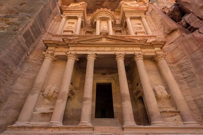 Você terá quase um dia inteiro para explorar Petra com seu guia — incluindo a caminhada pelo Siq, visita aos principais pontos como o Tesouro e tempo para o almoço antes de seguir para Wadi Rum.