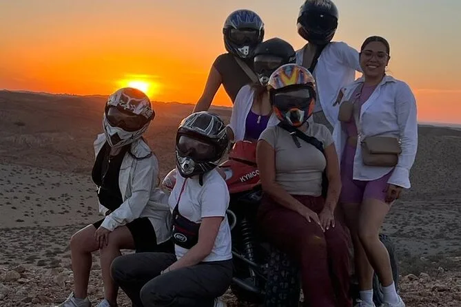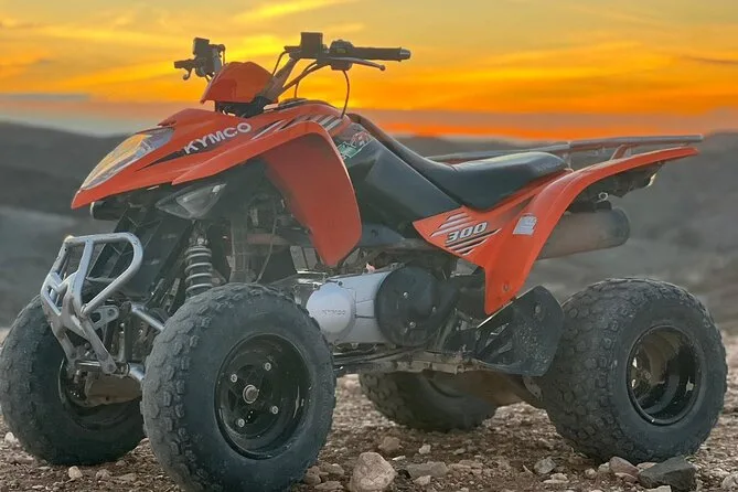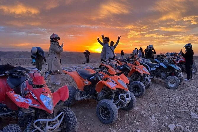 Depois vieram os quadriciclos — mais barulhentos, claro, mas muito mais divertidos do que eu imaginava. Seguimos o Youssef até o topo de uma colina para ver o pôr do sol. A vista de Agafay é difícil de descrever: não são dunas infinitas como no Saara, mas colinas rochosas que mudam de cor a cada minuto. Teve um momento em que tudo ficou laranja e todo mundo parou de falar por um segundo. Ainda lembro dessa imagem quando fico preso no trânsito lá em casa.