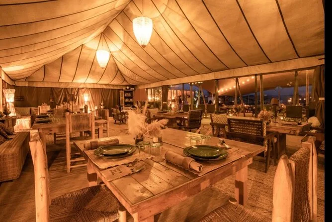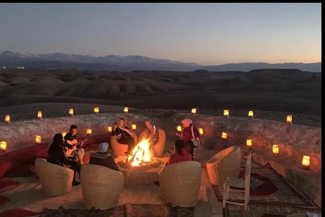 Sua noite inclui transporte em veículo com ar-condicionado de Marrakech ao Deserto de Agafay, passeio guiado de camelo ao pôr do sol, água mineral durante todo o trajeto, música tradicional marroquina-berbere no acampamento, café ou chá com a refeição, jantar completo ao estilo berbere sob as estrelas e um animado show de fogo antes do retorno à cidade.
