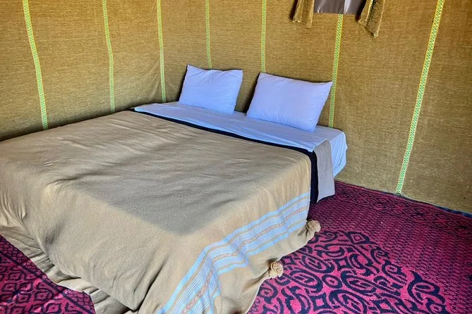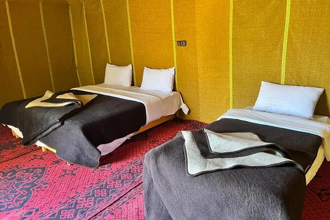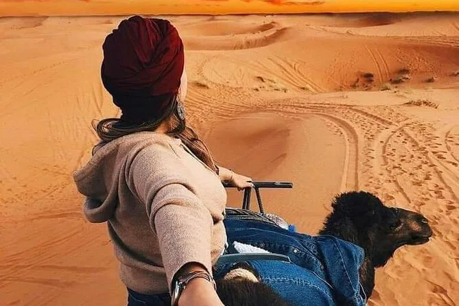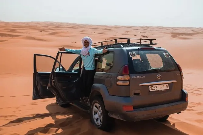 Seu roteiro de três dias inclui transfer do hotel em Fez, transporte em veículo com ar-condicionado e um guia motorista simpático que conta histórias pelo caminho, duas noites de hospedagem (uma no acampamento do deserto), passeio de camelo pelas dunas de Erg Chebbi — ou transfer de 4x4 se preferir evitar o camelo — e desembarque no seu hotel em Marrakech ao final.
