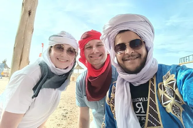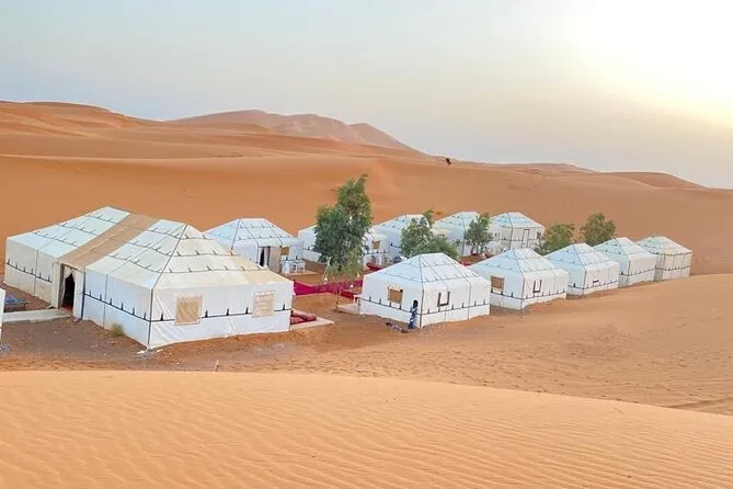 Sua viagem inclui transfer do hotel em Fez, todo o transporte em minivan ou micro-ônibus com ar-condicionado e motorista profissional, duas noites de hospedagem (uma em acampamento com tendas berberes e passeio de camelo em Erg Chebbi e outra em hotel 3 estrelas), oportunidade de sandboard, visitas guiadas em Rissani e Ait Ben Haddou, além de jantares tradicionais sob o céu do Saara antes de chegar a Marrakech.