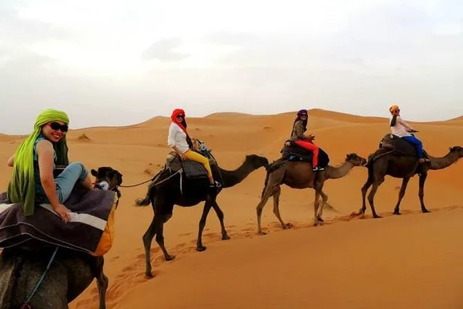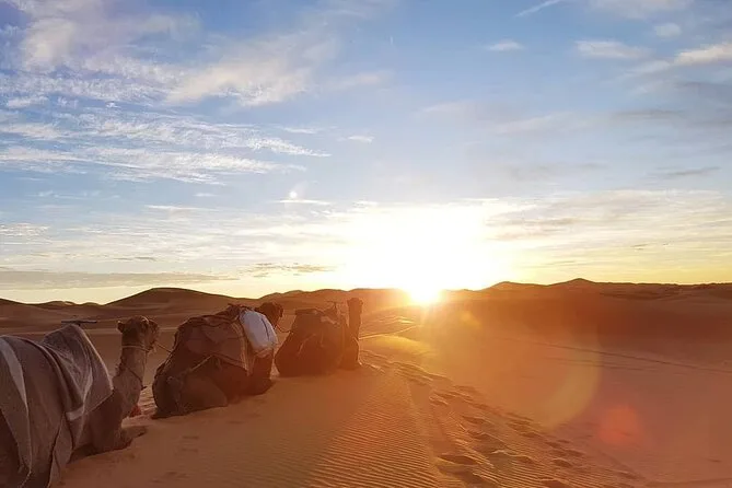 Sua viagem inclui traslado do seu hotel ou riad em Fez com motorista que fala inglês ou francês, transporte confortável pelas montanhas do Médio Atlas com paradas pelo caminho, trekking de camelo nas dunas do Erg Chebbi em Merzouga, jantar e pernoite em um acampamento berbere padrão sob as estrelas, café da manhã antes da saída para Marrakech, além do desembarque no destino final.