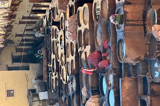 Não dá para visitar Fez sem conhecer o Curtume Chouara. Subimos até um terraço com vista para as cubas de tintura — vermelhos, amarelos, azuis — e vimos os trabalhadores transformando peles em couro com técnicas que não mudam desde a Idade Média. O cheiro é forte (ramos de hortelã ajudam!), mas ver esse ofício antigo de perto vale muito a pena.