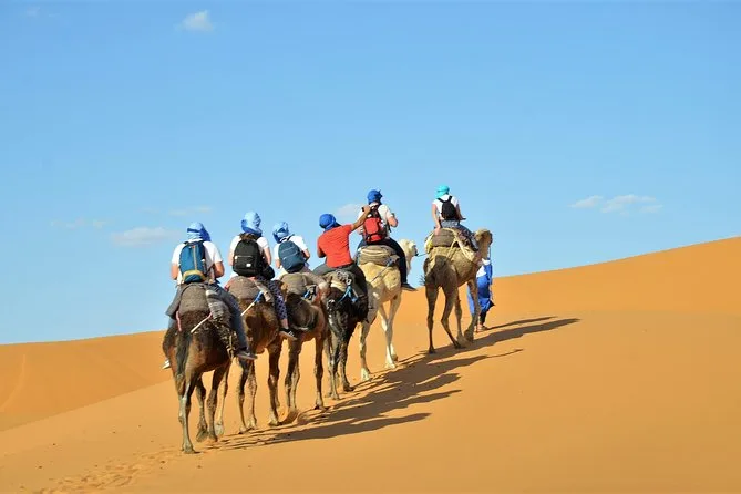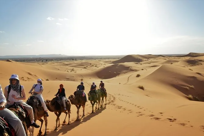 Sim, você vai montar camelos para chegar ao acampamento ao pôr do sol e sair ao nascer do sol nas dunas de Erg Chebbi.