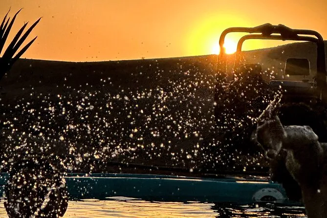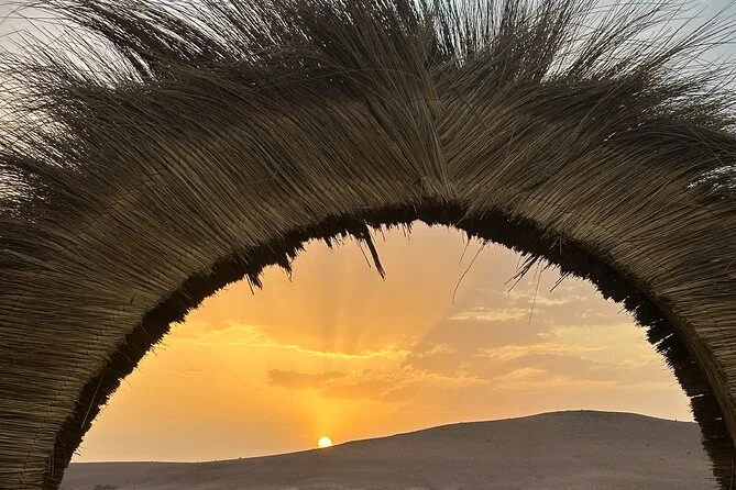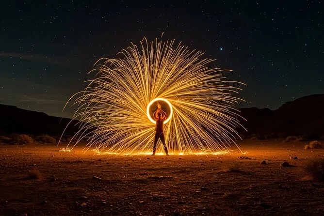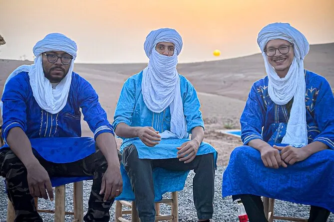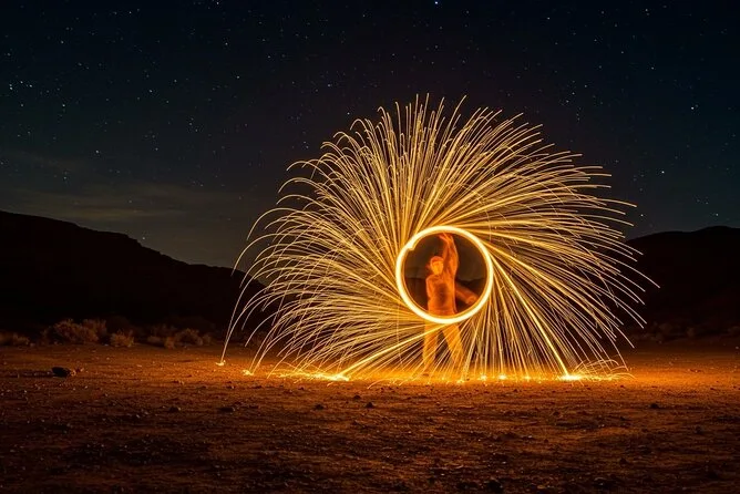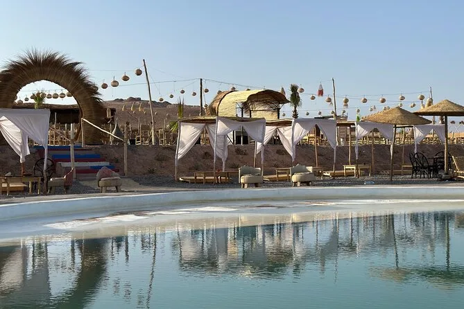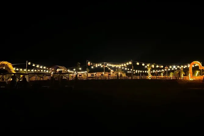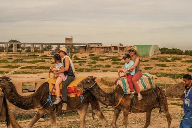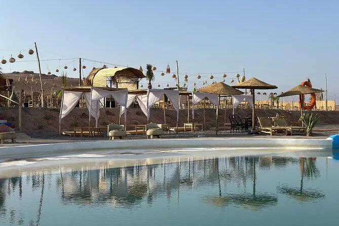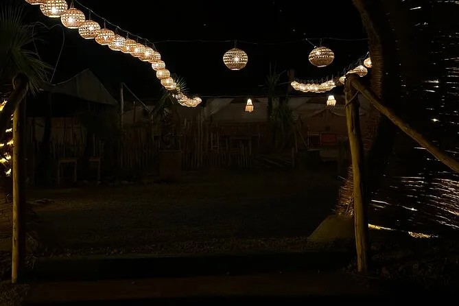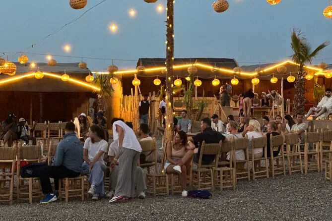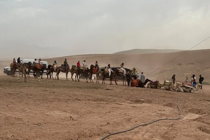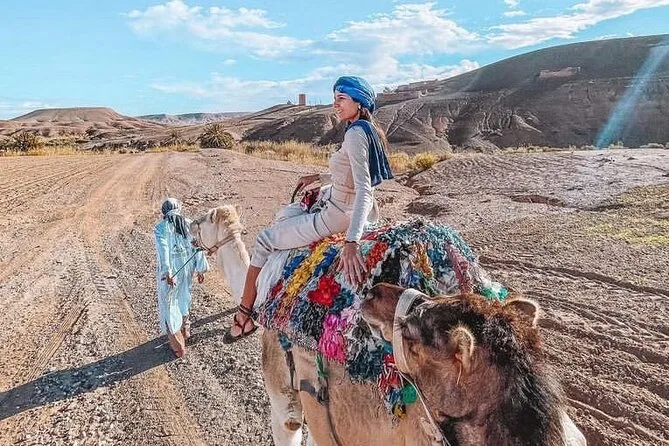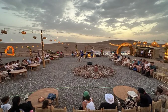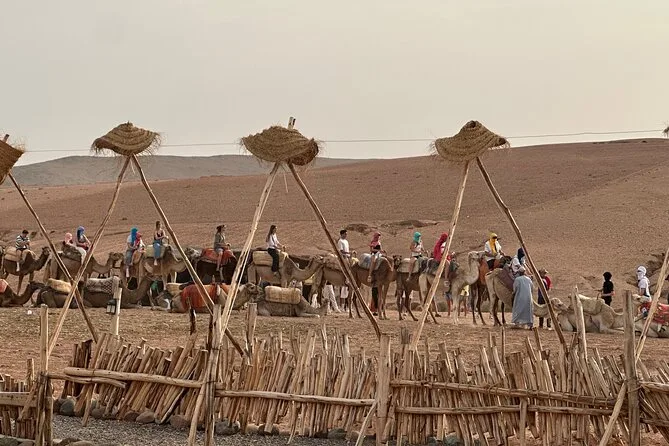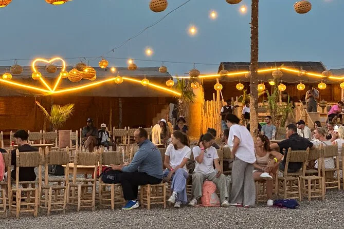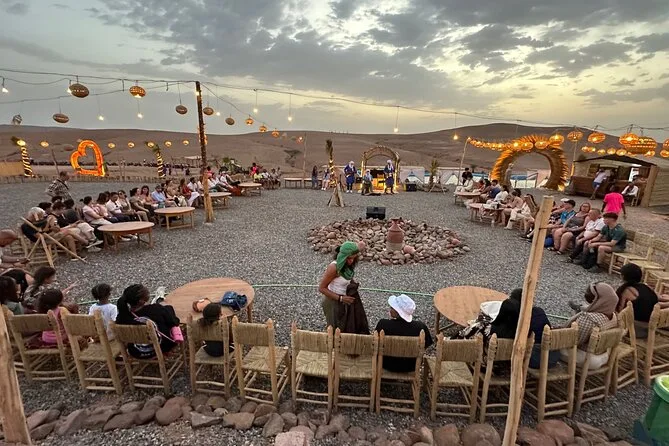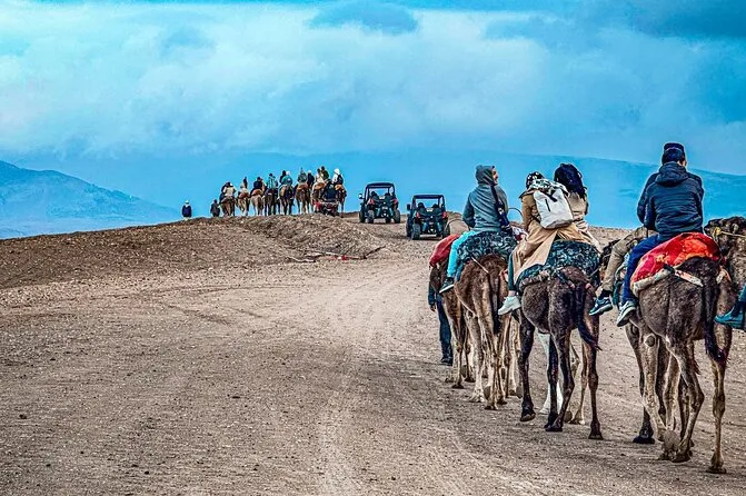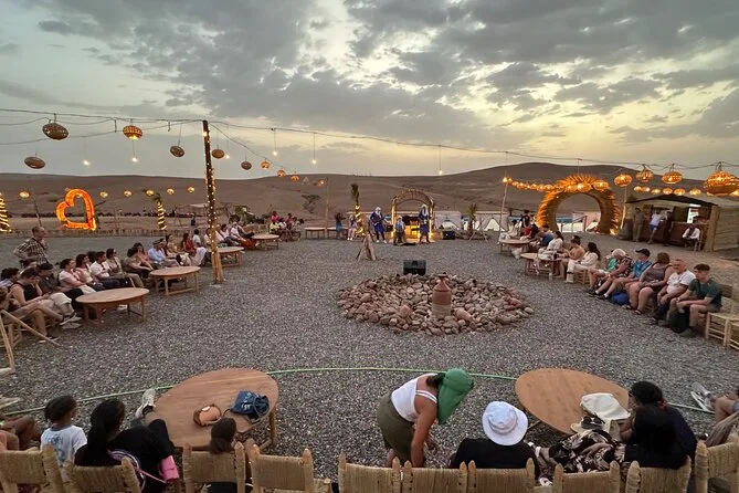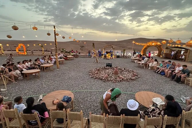 Sua noite inclui transporte de ida e volta do seu hotel em Marrakech ou ponto próximo ao riad, passeio guiado de camelo pelo Deserto de Agafay, cerca de 40 minutos de quadriciclo (compartilhado), visita a uma cooperativa de mulheres produtoras de óleo de argan com degustação de chá, jantar tradicional marroquino sob tenda berbere com música ao vivo e show de fogo — tudo isso antes de voltar para a cidade.