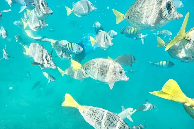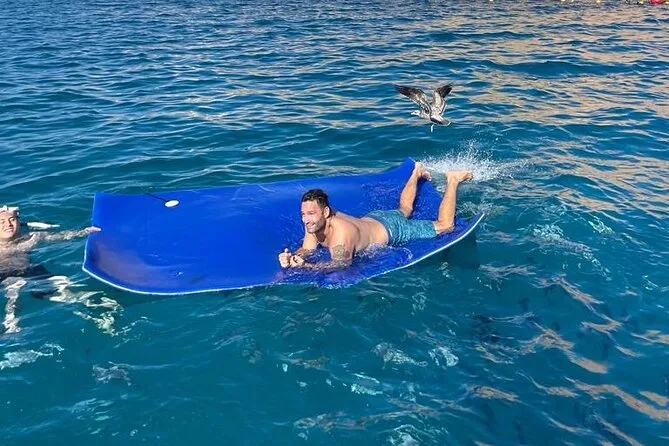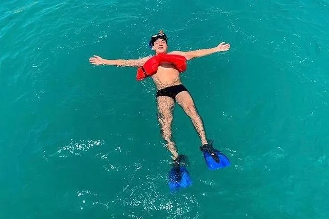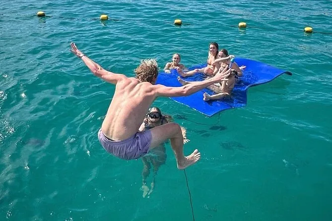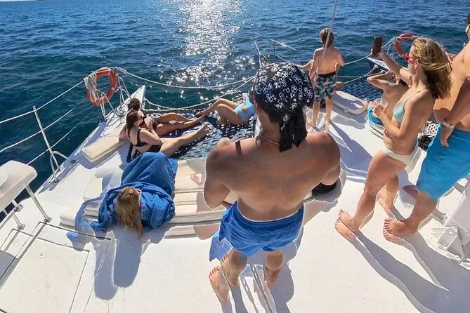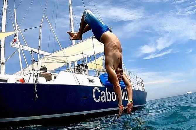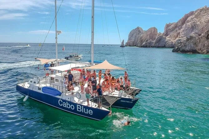 Seu dia inclui embarque no píer principal da marina de Cabo com uma equipe local simpática recebendo você a bordo de um trimaran espaçoso. Você terá todo o equipamento de snorkel à disposição, além de pranchas de stand up e um tapete flutuante quando o mar permitir. O almoço é preparado a bordo — pense em baguetes de peru com acompanhamentos como guacamole e frutas — e há bar aberto com bebidas durante todo o passeio antes do retorno ao porto em Cabo San Lucas.
