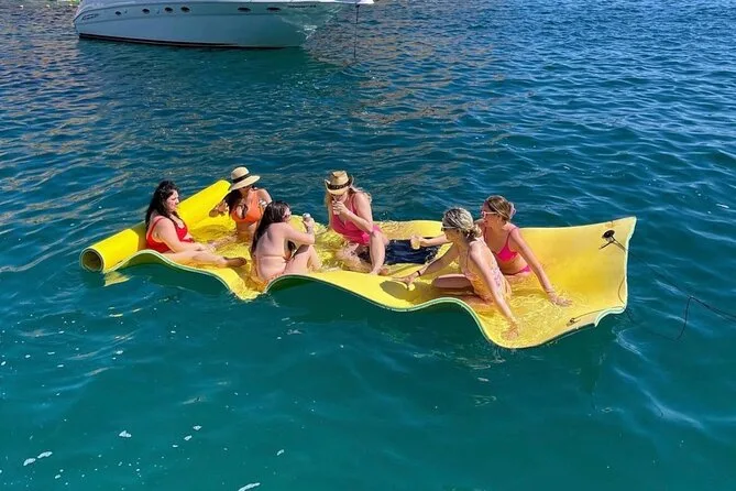 Depois seguimos para a Baía de Santa Maria para o snorkel. A água parecia até irreal — tão cristalina que dava pra ver os peixes antes mesmo de entrar. Nos deram o equipamento (sempre fico com medo de máscara vazando, mas essas estavam perfeitas), além de pranchas de stand up e até um tapete flutuante que as crianças logo transformaram no navio pirata delas. O almoço chegou logo depois: baguetes de peru, guacamole, salsa, chips — simples, mas perfeito depois de nadar atrás dos peixes-papagaio. O bar aberto continuou rolando; dessa vez fiquei na água fresca, porque sol e tequila = cochilo na certa.