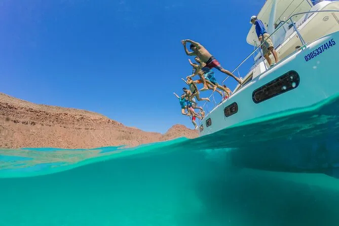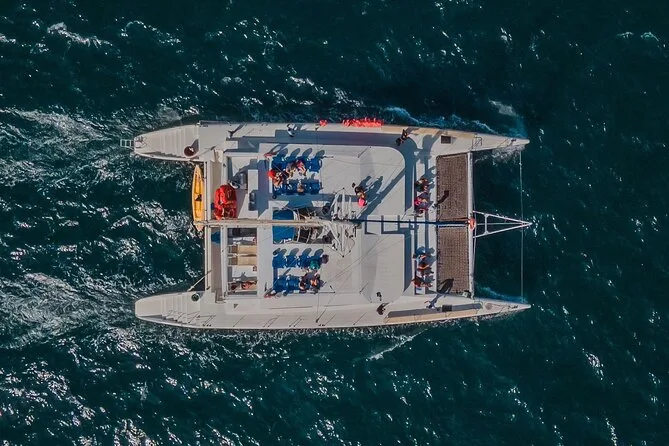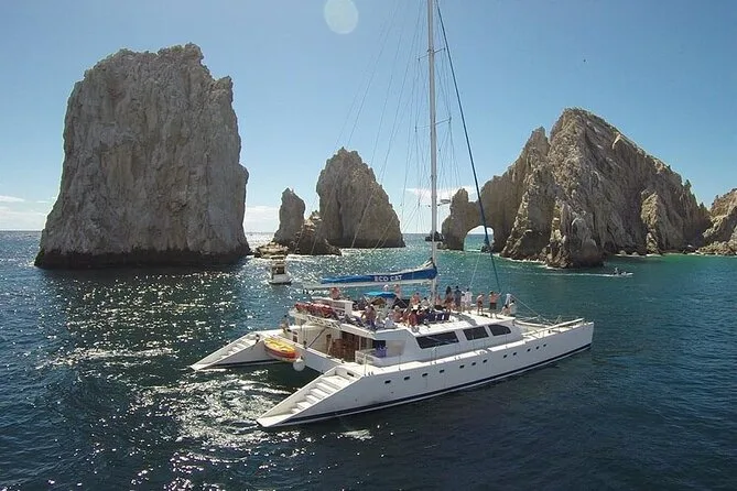 Seu dia inclui open bar ilimitado com cerveja e refrigerantes assim que embarcar, assentos com sombra ou no convés aberto em um trimarã com banheiro, além da opção de transfer ida e volta do hotel por um valor extra antes do passeio sair da marina de Cabo San Lucas.