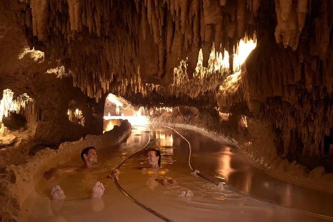 Conhecemos a Carla, uma funcionária da Sludgerie, que nos entregou toalhas depois que escorregamos naquele banho de lama (é mais quente do que parece). Ela riu quando tentei dizer “gracias” com a boca cheia de suco de laranja do jardim de degustação — definitivamente não acertei. Tem também rios tranquilos onde você flutua passando por estalactites enquanto luzes coloridas piscam no teto; alguém atrás de mim começou a cantar baixinho em espanhol e, por um instante, tudo ficou lento e leve. Depois de tudo isso, sentar no sol perto daqueles cenotes falsos parecia até real de tão gostoso.