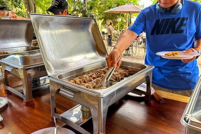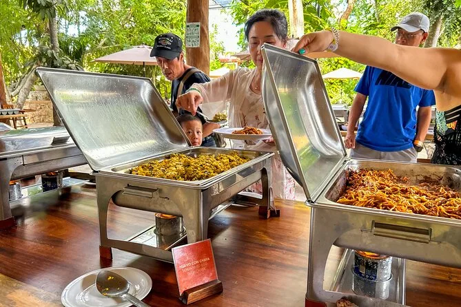 O almoço era um buffet simples — vários pratos pequenos, nada sofisticado, mas ótimo depois de caminhar a manhã toda. A parada no cenote depois foi incrível… água gelada, ecos batendo nas paredes de pedra, raios de sol entrando por uma abertura no teto. Tem que usar colete salva-vidas (eles conferem), parece bobo até você perceber a profundidade. Tem uma cachoeira em uma ponta e o som preenche a cabeça. Ainda lembro dessa sensação às vezes.