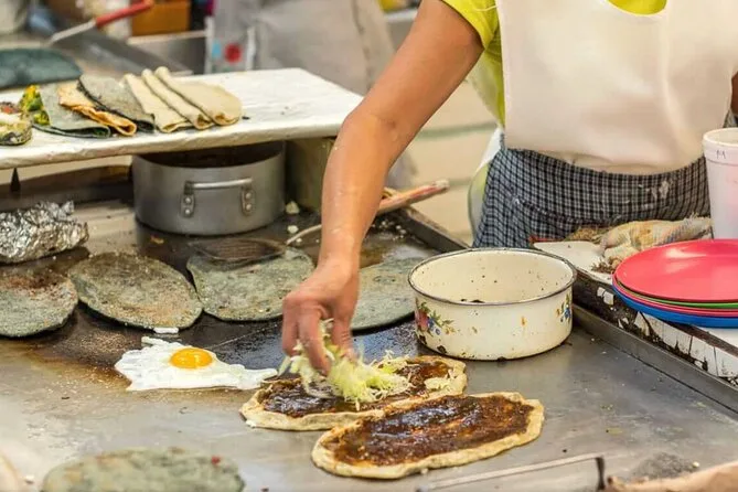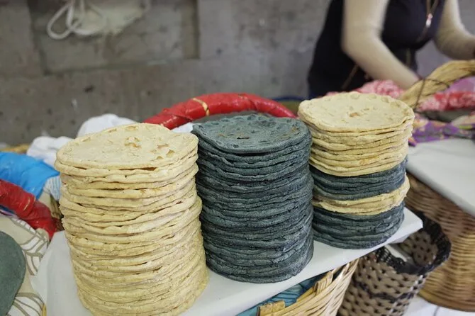 Você vai experimentar tlacoyos (bolinhos de milho), tamales em folha de bananeira feitos pelos locais, chileatole (bebida de milho), além de produtos sazonais do mercado e das chinampas durante o almoço.