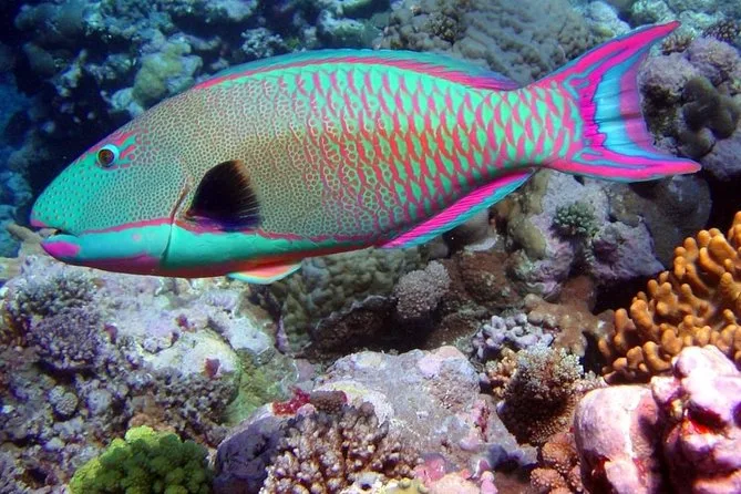 O tour inclui dois pontos com 45 minutos de snorkel em cada, dentro da reserva da biosfera.