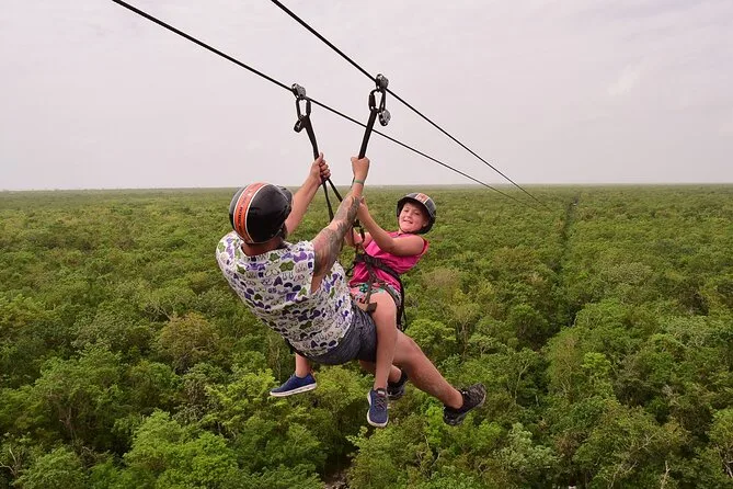 O dia inclui uso do ATV (individual ou compartilhado), capacete para segurança, água mineral para hidratação, lanches leves após as aventuras, além de todo o equipamento necessário para tirolesa, rapel e nado nos cenotes antes de sair da selva.