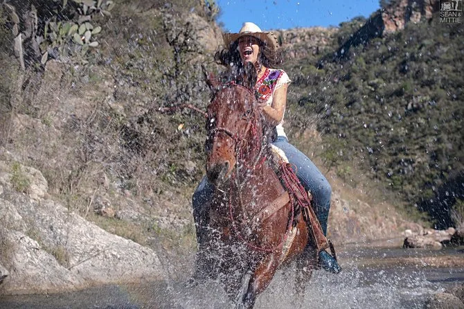 Seu dia inclui transporte de ida e volta de San Miguel de Allende, água mineral durante o passeio, instruções completas e aula de equitação antes de seguir pelas trilhas do cânion por 2,5 horas a cavalo — com pausas — e termina com um almoço orgânico estilo rancho preparado na hora em uma das casitas da fazenda, antes do retorno.