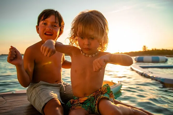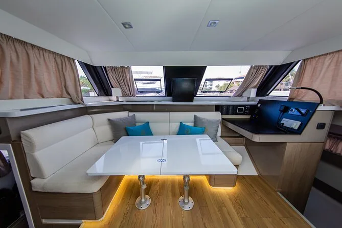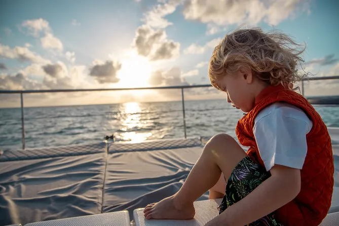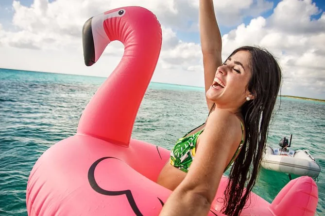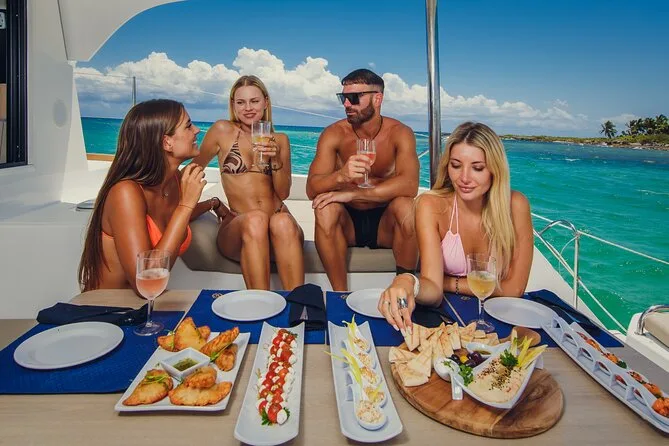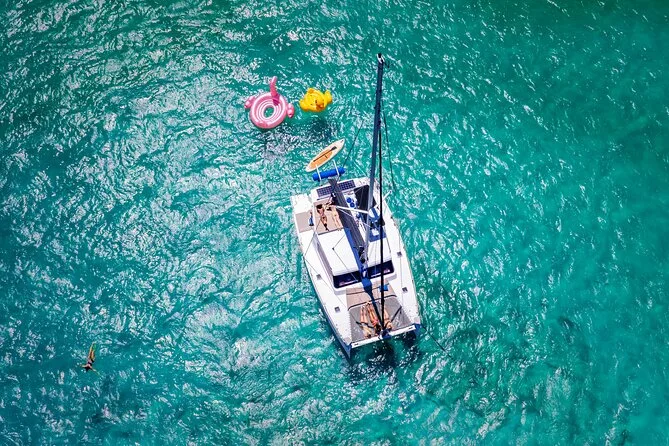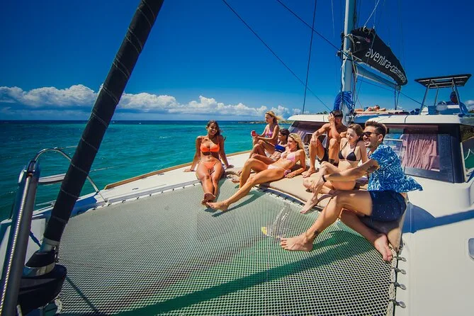 Seu dia inclui navegação em catamarã de 34' saindo de Puerto Aventuras com todo o equipamento para snorkel, open bar ilimitado durante o passeio, petiscos e almoço preparados pelo chef servidos pela equipe local, além de acesso a stand up paddles e boias para relaxar ou se divertir nas águas mornas do Caribe antes do retorno à tarde.
