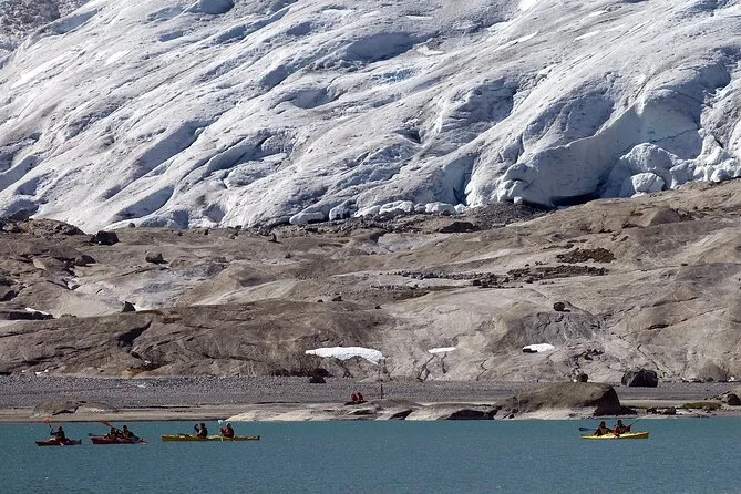 O passeio de caiaque leva cerca de 30 minutos para atravessar o lago do glaciar.