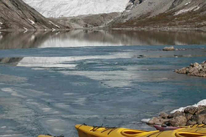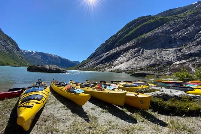 Seu dia inclui todo o equipamento para atravessar o lago do Nigardsbreen de caiaque, além de crampons e equipamentos de segurança para a caminhada no glaciar — com histórias do seu guia local antes do retorno pelo lago.