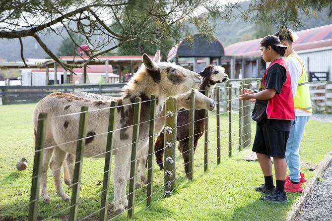 A viagem passa pelos subúrbios rurais de Auckland; o tempo varia conforme o trânsito, mas o guia cuida para ser confortável.