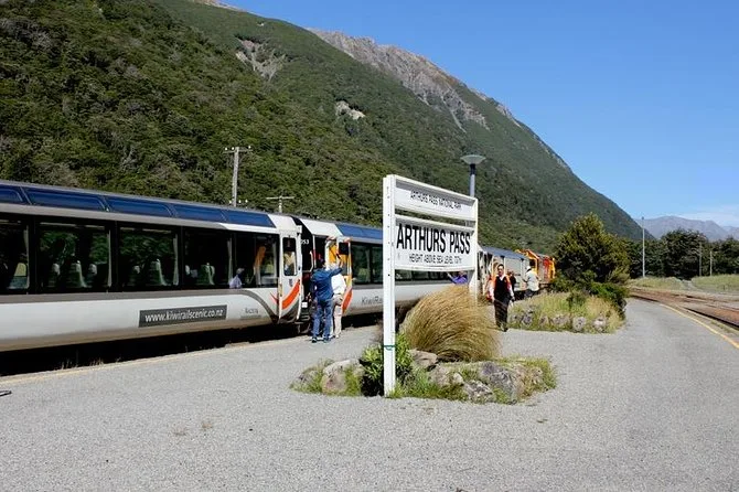 Você vai de trem TranzAlpine de Christchurch a Arthur's Pass; o retorno é feito de minivan com o guia.