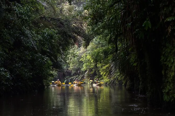 Você vai remar no Lago Karapiro ao entardecer com um guia local, passar por história submersa na barragem Horahora e seguir pelo córrego Pokaiwhenua enquanto a noite cai. Samambaias nativas pendem sobre a água e vagalumes iluminam as paredes do cânion — é uma experiência tranquila, quase mágica, com todo o equipamento incluso para você só chegar e remar.