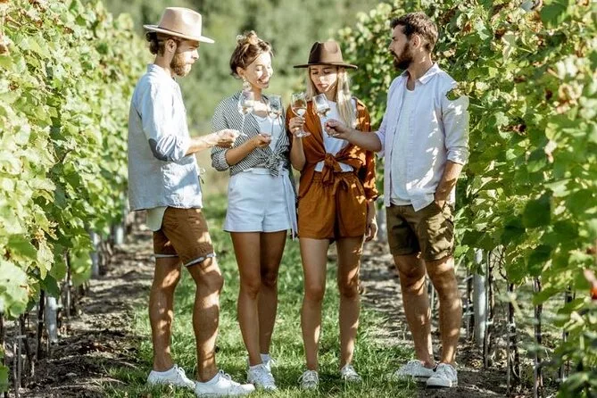 O foco é na degustação de vinhos; não bebedores podem participar, mas todas as paradas são em vinícolas.