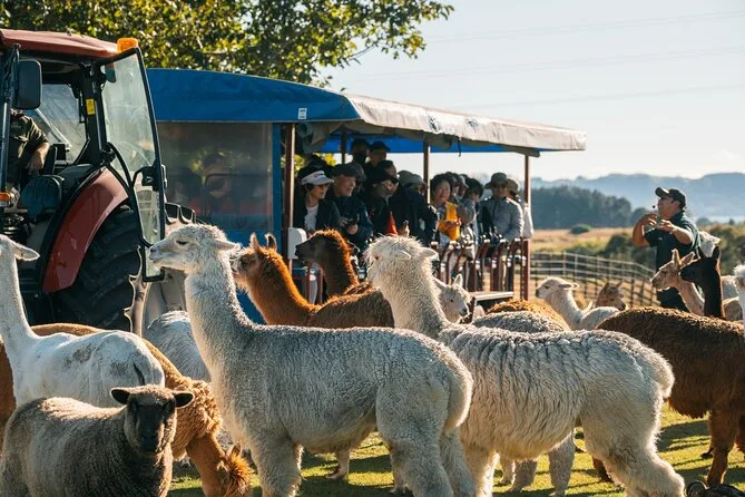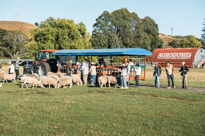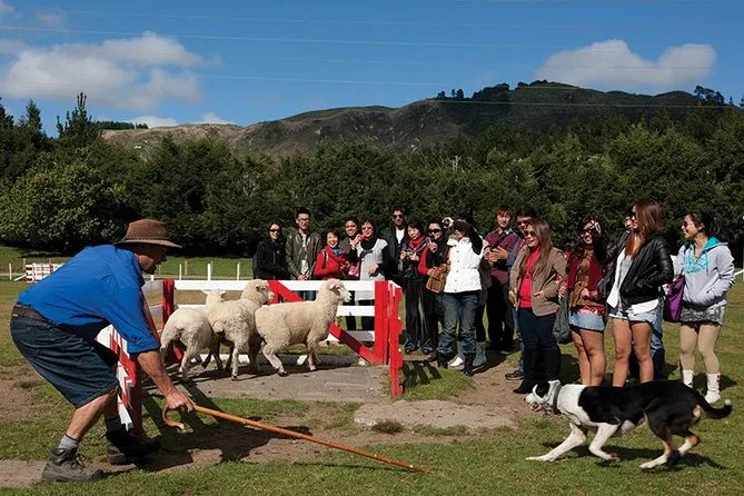 Seu dia inclui entrada para o Farm Show e o Farm Tour no Agrodome, perto de Rotorua. Você vai alimentar alpacas e ovelhas com as mãos, visitar o berçário dos filhotes, fazer um passeio de uma hora em trailer de trator pelos pastos (chuva ou sol), assistir às demonstrações ao vivo com cães e ovelhas, e ainda provar mel e suco de kiwi fresquinhos.
