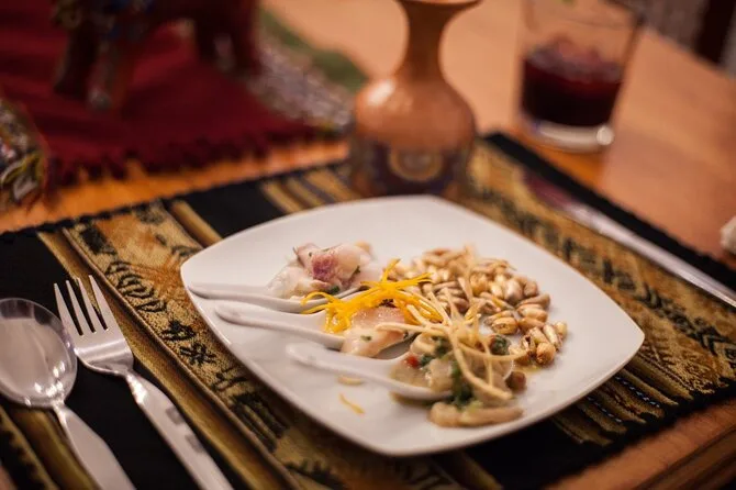 Depois do mercado, entramos numa cozinha pequena ali perto. A luz do sol entrava pelas janelas e alguém colocou uma salsa baixinho no fundo. Começamos com pisco sours (acho que exagerei no limão, mas ninguém se importou), e logo estávamos com as mãos na massa preparando ceviche de três jeitos. A chef explicou cada ingrediente — alga kushuro das lagoas andinas, feijão tarwi, camu camu — e dava para sentir o orgulho na voz dela, que me fez prestar atenção. Ela riu quando tentei falar “mashua”. Acho que destruí a palavra.