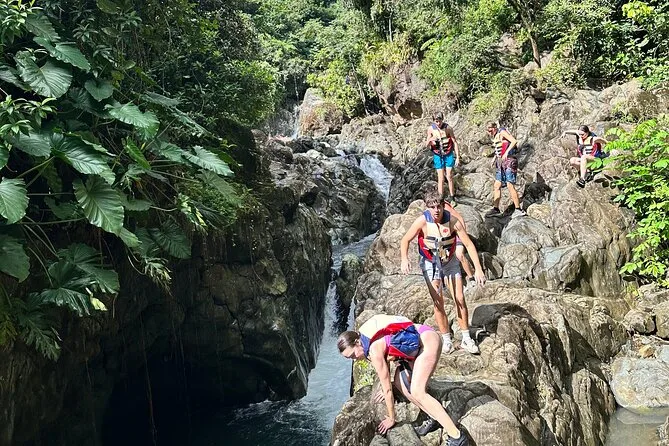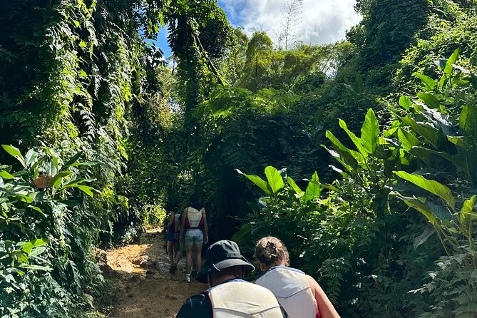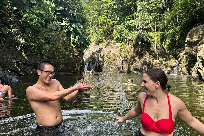 Você vai fazer uma trilha em El Yunque com grupo pequeno e guia local, ouvir histórias sobre plantas nativas, escorregar em pedras vulcânicas para piscinas naturais (com colete salva-vidas), balançar em cordas ou pular se tiver coragem, e terminar com frutas frescas antes de voltar — tênis sujos são opcionais, mas risadas garantidas.