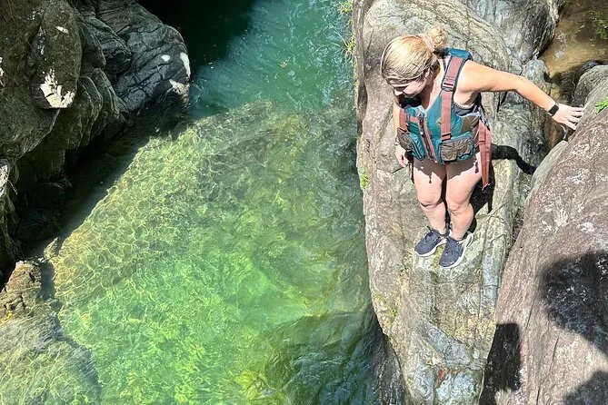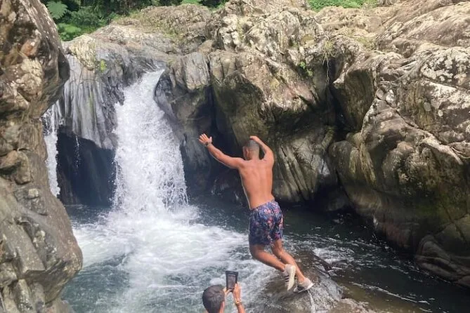 Confesso que hesitei na hora do tobogã natural — parecia mais rápido do que eu esperava. Mas todo mundo se animou e se incentivou (um cara até fez um salto dramático), e o Luis distribuiu coletes salva-vidas para quem estava com medo de nadar. A água estava fria o suficiente para me fazer soltar um grito, mas depois de escorregar pela pedra vulcânica e cair naquela piscina cercada pela mata, me senti mais desperto do que com café. Tinha também saltos de alturas variadas para quem quisesse se arriscar, e um balanço de corda que me fez rir tanto que a barriga doeu.