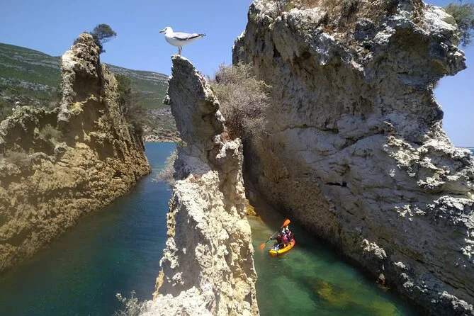 A costa aqui é toda feita de calcário recortado e grutas misteriosas. Paramos na Lapa de Santa Margarida — o João mostrou fósseis presos na pedra como se fossem moedas antigas, e quando disse que alguns tinham milhões de anos quase larguei o remo. Teve um momento em que subimos numa pedra para saltar do penhasco — minhas pernas tremiam um pouco, confesso — e de repente eu estava no ar, com a água fria e borbulhante me envolvendo. Alguém distribuiu lanchinhos de uma bolsa seca (acho que era figo e queijo da região) enquanto flutuávamos perto da Praia da Anicha. Sal na boca, sol nos olhos, e todo mundo rindo da nossa dificuldade para voltar aos caiaques.